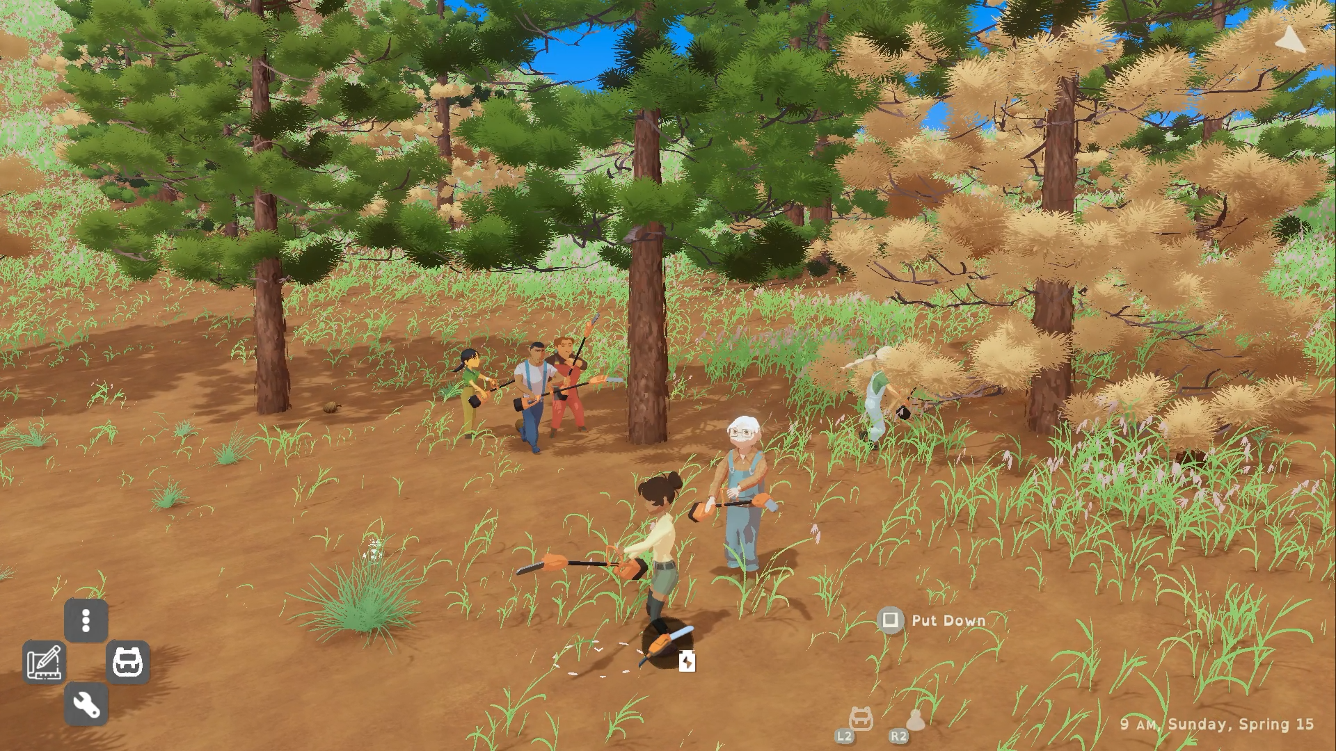 The player starts alone but quickly gathers her crew when the job proves too big. In solo mode, each press of A sends the next available crew member to fell a selected tree, letting her maintain precision while scaling up the work.