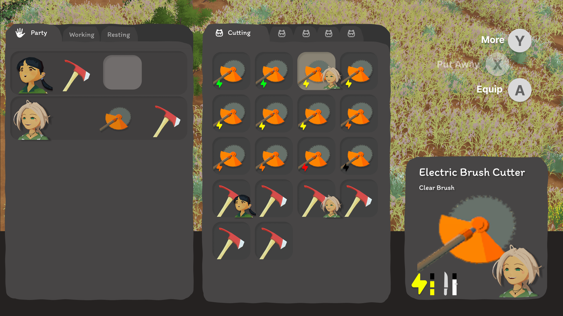Testing showed players rarely wanted to multitask this way. The new design simplifies tool selection to two choices: who's got what tools, and which tool or item is the party currently using.