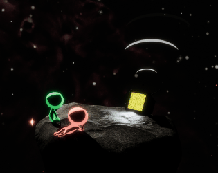 Each remote client becomes its own planetoid with a TV. When players join by pressing a button on their controller, a character in their player color appears on that client's planetoid.